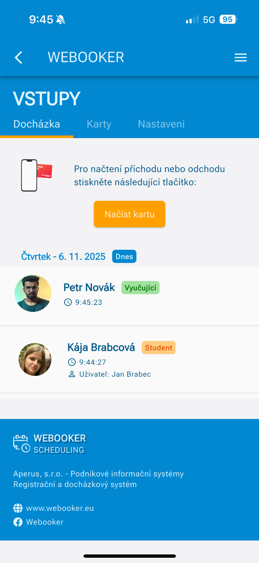 Nabízené řešení využívá mobilní aplikace se čtečkou NFC. Tato aplikace přiřadí dětem i pečujícím osobám karty a načítá příchody a odchody z čipových karet. Ostatní administraci najdete v Online rezervačním systému Webooker, který je s mobilní aplikací propojen. Splňuje přesně požadavky dotačního programu ESF a to včetně exportů do xls (xlsx).